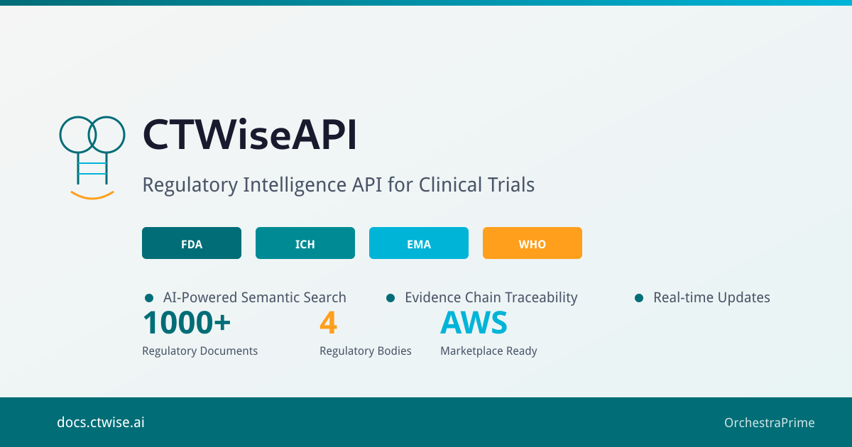 ## 概要 CTWiseはFDA CFR Title 21、ICHガイドライン(E6 GCP、E8、E9)、EMA規制、WHOガイダンスへの即時・プログラム的アクセスを提供する規制ルールAPIで...