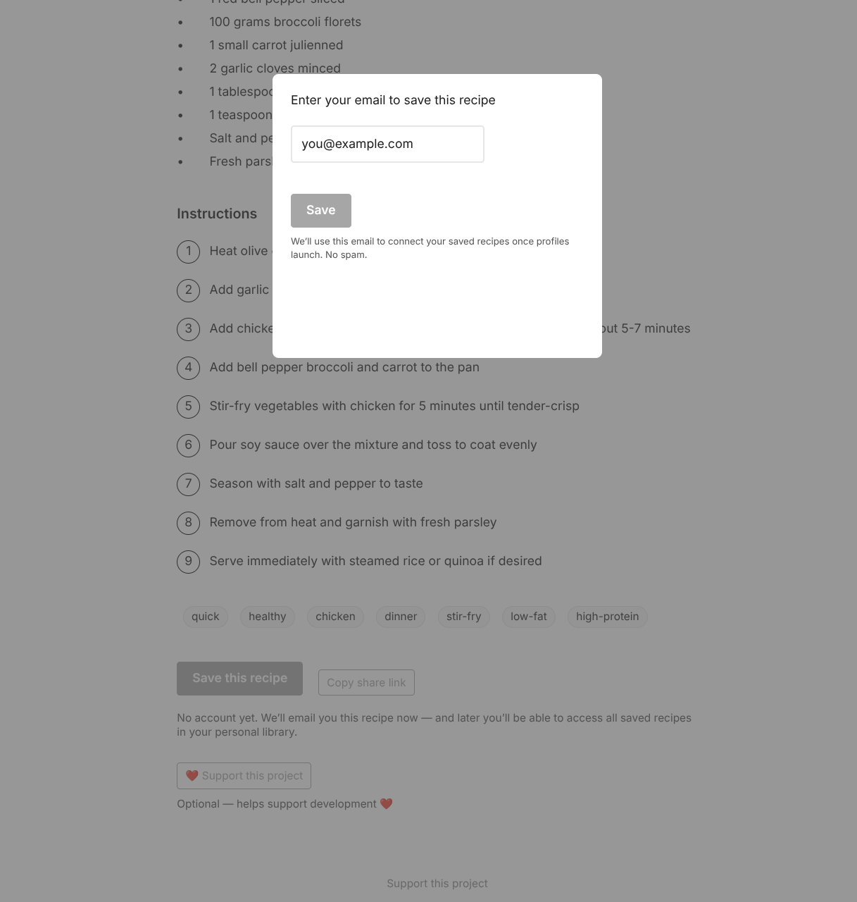 ## 製品概要 煩雑さのない、シンプルで高速なAIレシピを提供するミニマルな体験。アカウント不要・ノイズなし・煩雑さを排する設計で、食の体験をソフトウェアの良い挙動に近づけます。 ## 主な特...