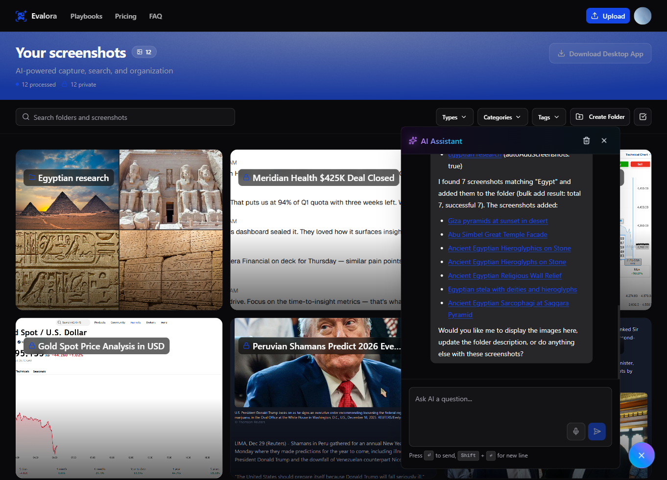 ## 概要 EvaloraはAIでスクリーンショットを理解し、アップロードした画像から自動的にタイトル・要約・カテゴリ・タグを生成します。ファイル名やフォルダだけではなく内容ベースで検索可能にな...