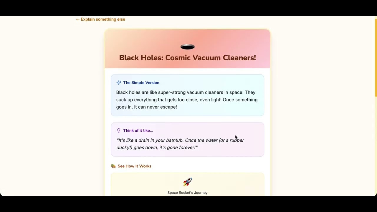 ## 概要 SimpleXplain は、複雑なテーマを楽しく視覚的な説明に変え、6歳児にも理解できるレベルまで落とします。入力するテーマは何でもOK。ブロックチェーン、光合成、量子物理学などを...