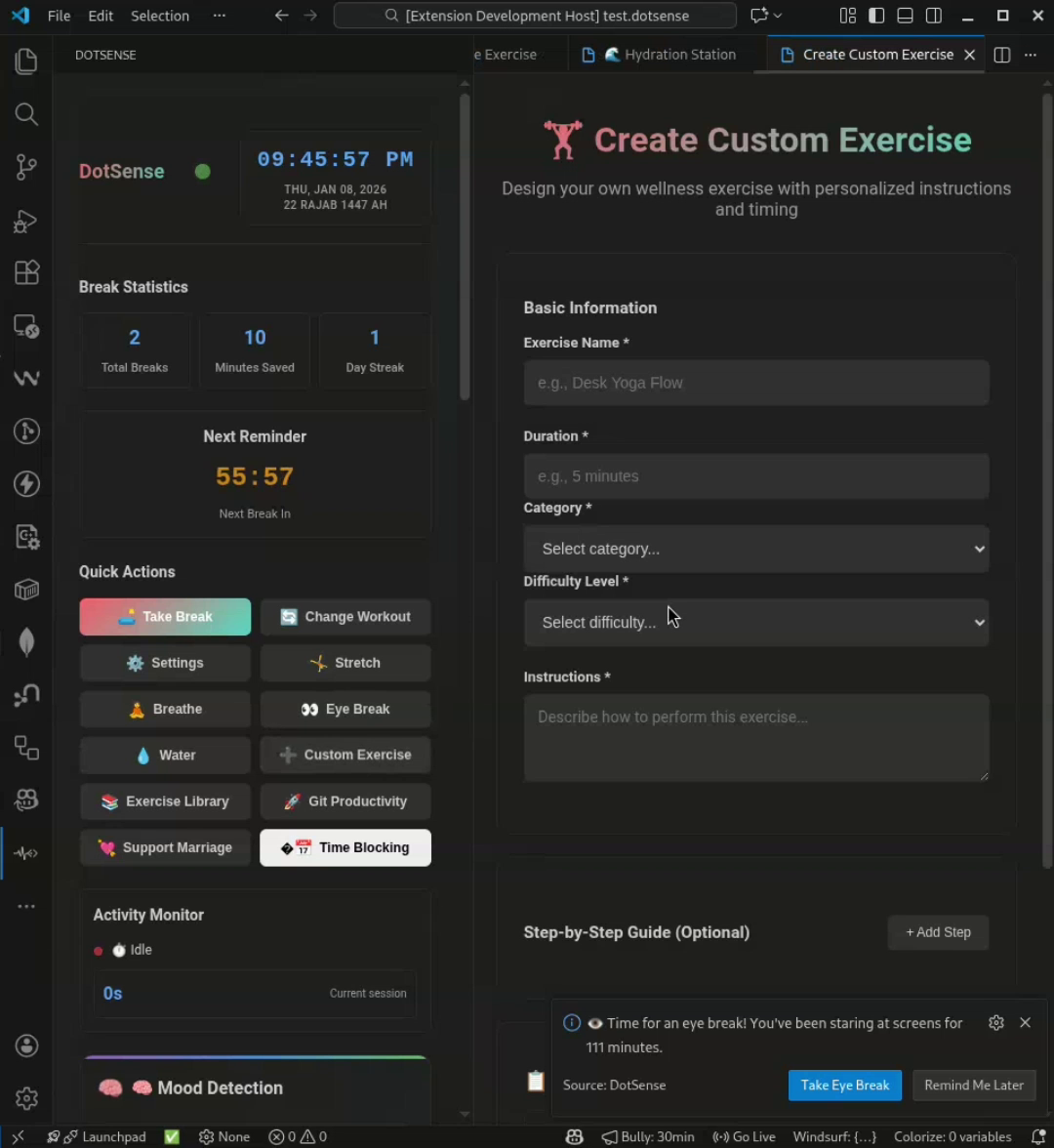 ## 概要 DotSenseは、VS Code用のオープンソース拡張で、入力パターンをローカルAIで分析し気分を推定します。イライラ・不安・集中の状態を判定し、バーンアウトを防ぐ呼吸法・ストレッ...