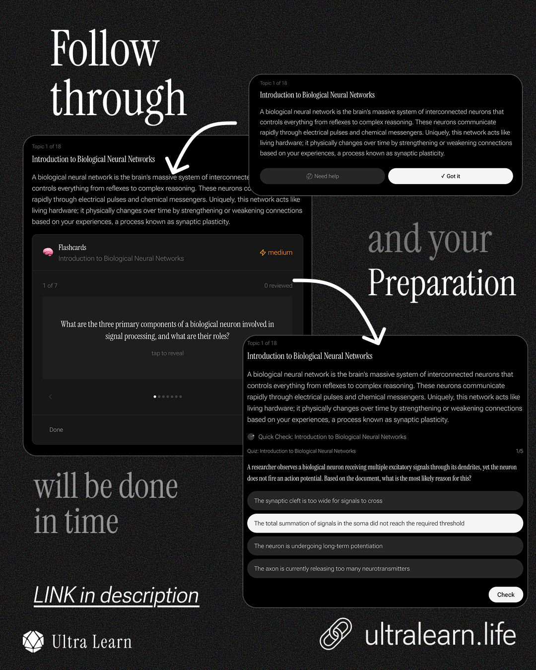 ## 概要 Ultra Learn AI は、受動的な情報摂取を能動的な習得へと変える対話型学習パートナーです。PDF・ノートをアップロードすると、要約・フラッシュカード・クイズを自動生成。質問...
