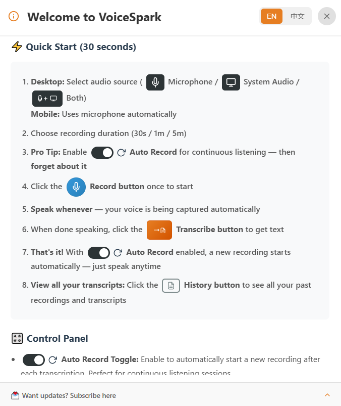 ## 製品概要 VoiceSparkは、常時待機で録音できるデスクトップ向けの音声メモツール。動画やポッドキャストのアイデアを逃さず、話すだけで直近の30秒〜5分を文字起こしします。 ## 主...
