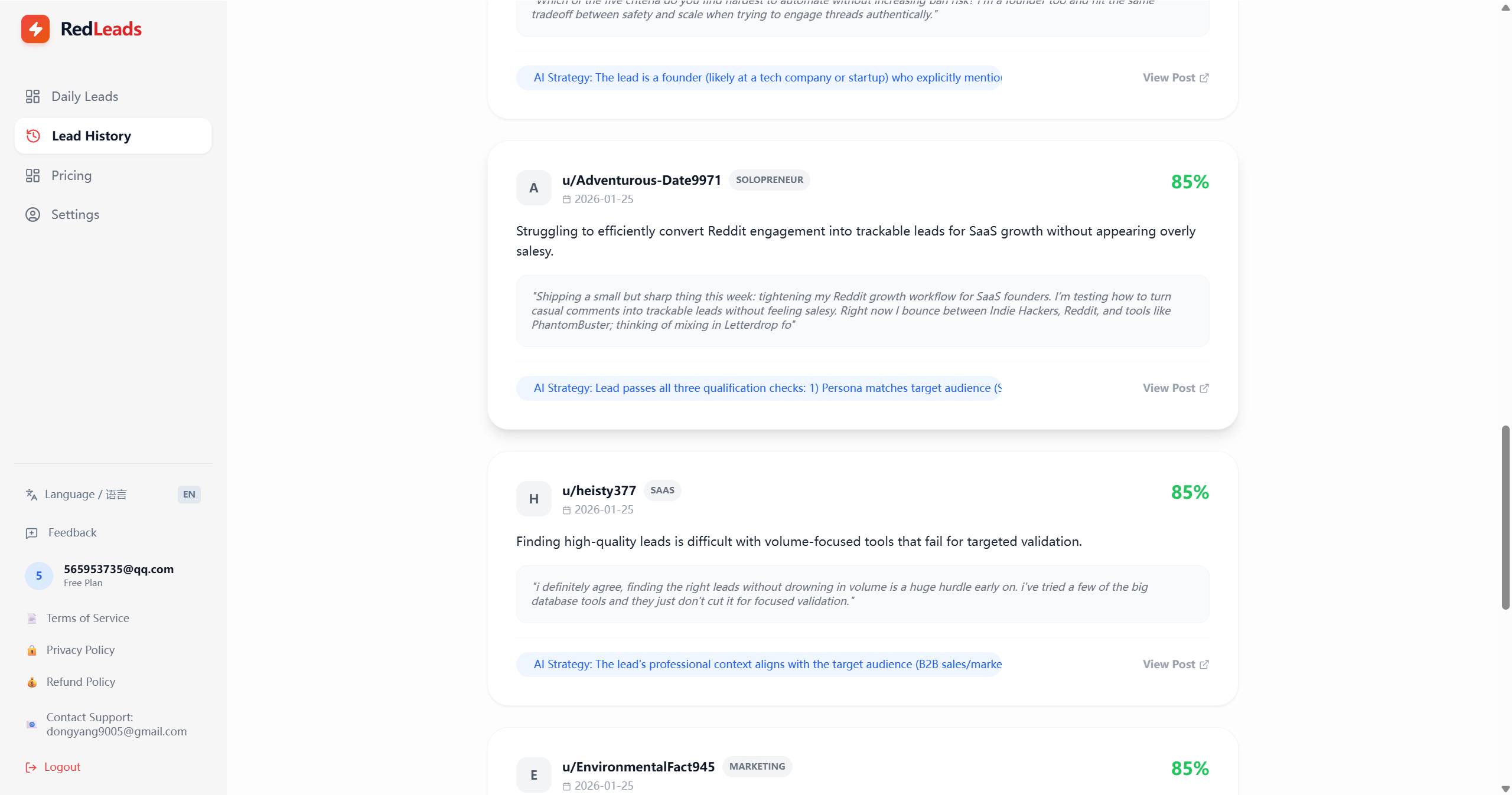 ## 概要 RedLeads AIは、Reddit上の会話を自動で解析して購買意欲の高い見込み客をセールスパイプラインへ結ぶツールです。キーワードだけでなく意図を理解する自律エンジンが、購買サイ...