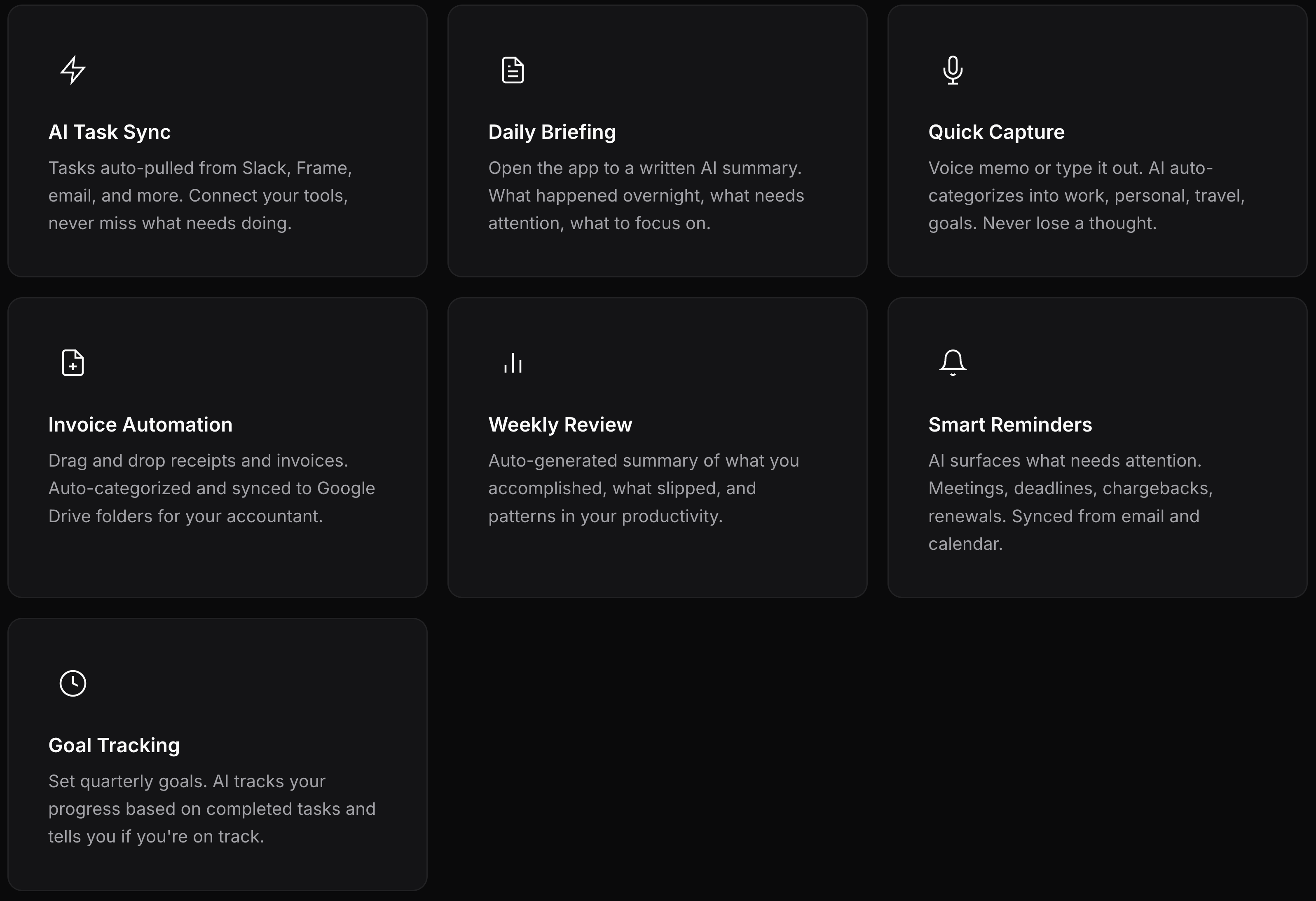 ##概要 創業者の朝の時間を短縮し、何をすべきかを即座に示すダッシュボード。Slack・Gmail・カレンダーなどを夜間に自動同期し、開けば優先事項が分かるブリーフィングを表示。 ##できるこ...