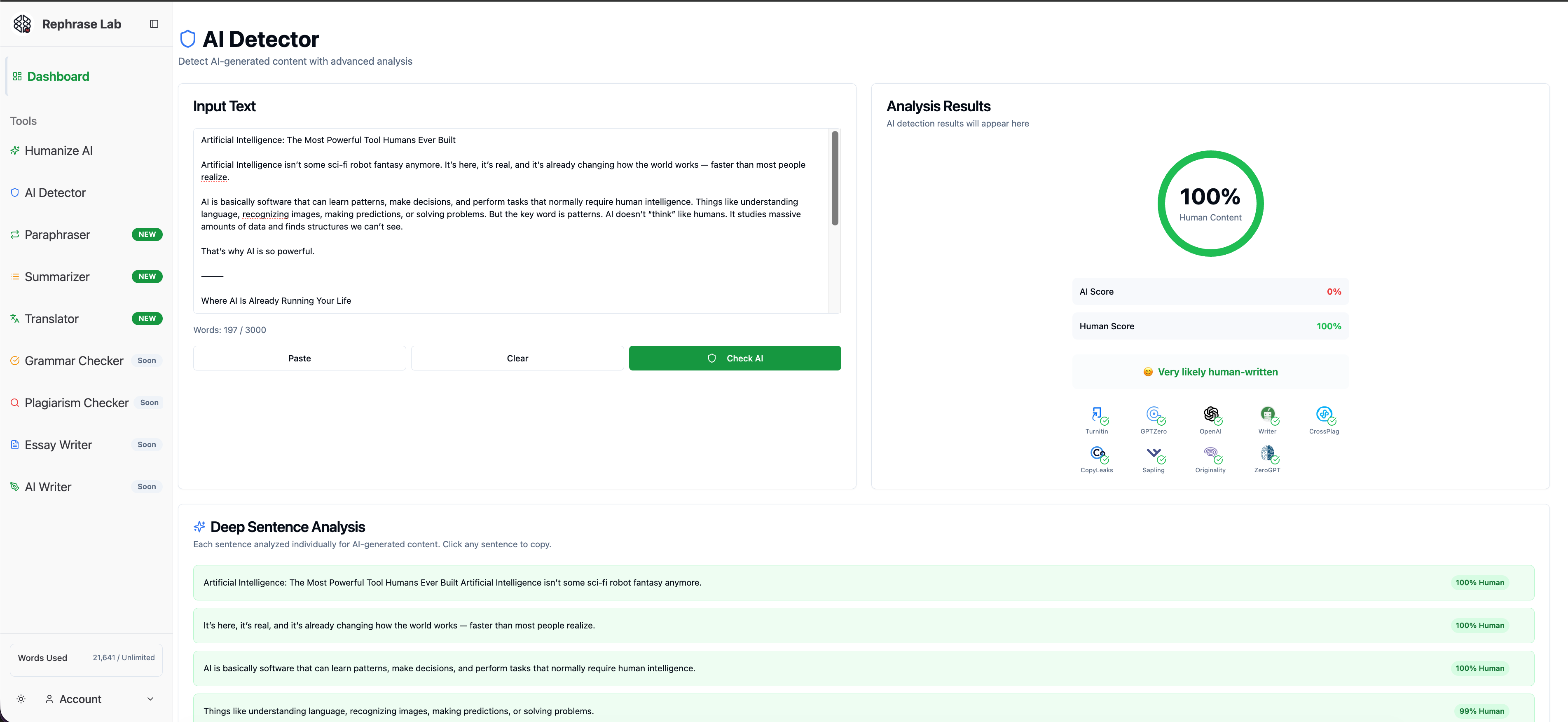 RephraseLabは、AI生成テキストを自然で人間らしい文章へリライト・洗練し、AI検出を回避することを支援するツールです。即時パラフレーズ、トーン変更、難解語の簡潔化、ネイティブライクな流...