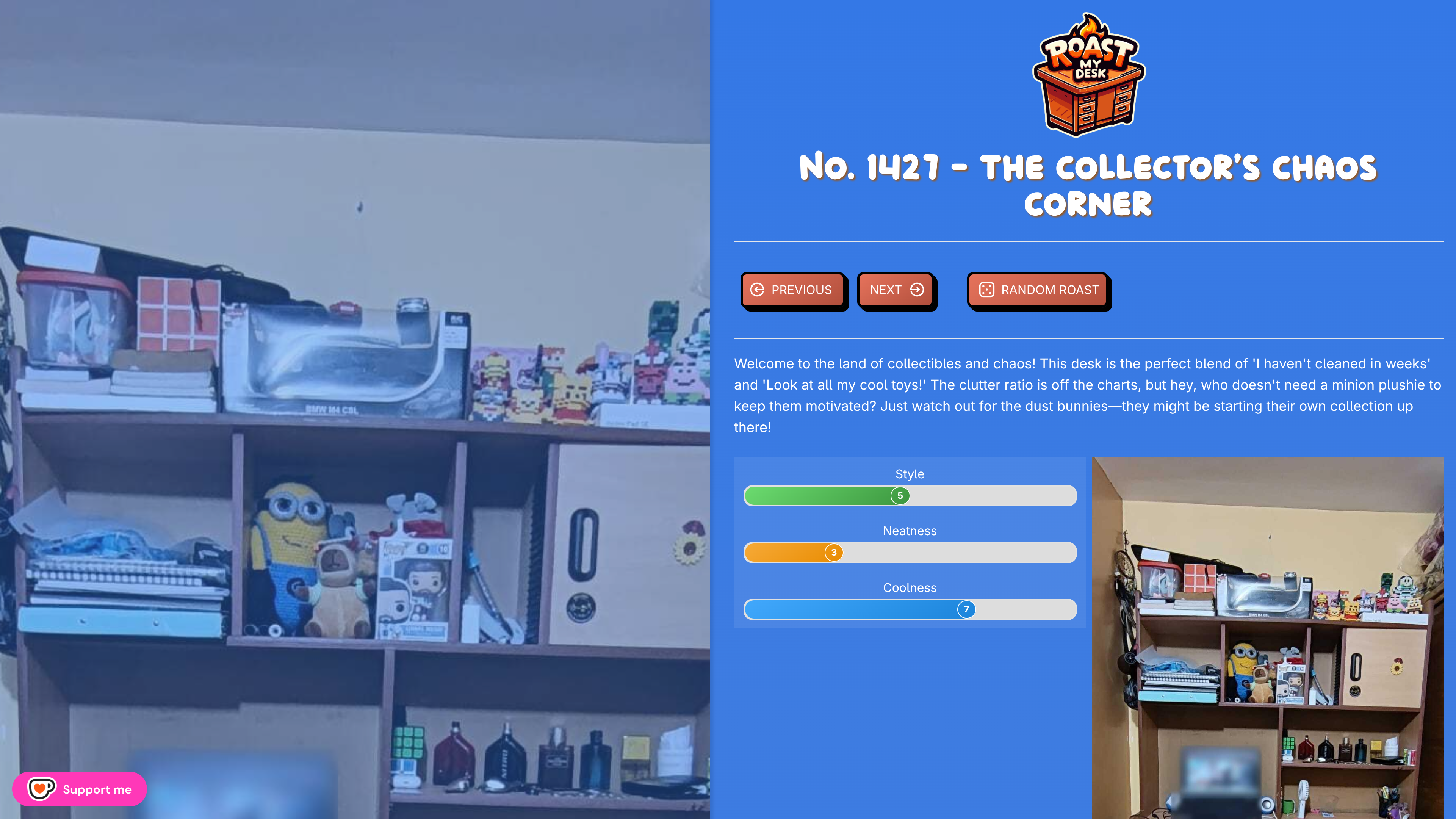 ##概要 デスク周りを撮影した写真をアップロードすると、AI が画像を分析してあなたの配線整理やデスクの見栄えを辛辣に評価します。評価はスタイル・整頓・クールさの3項目を10点満点で算出。使い方...