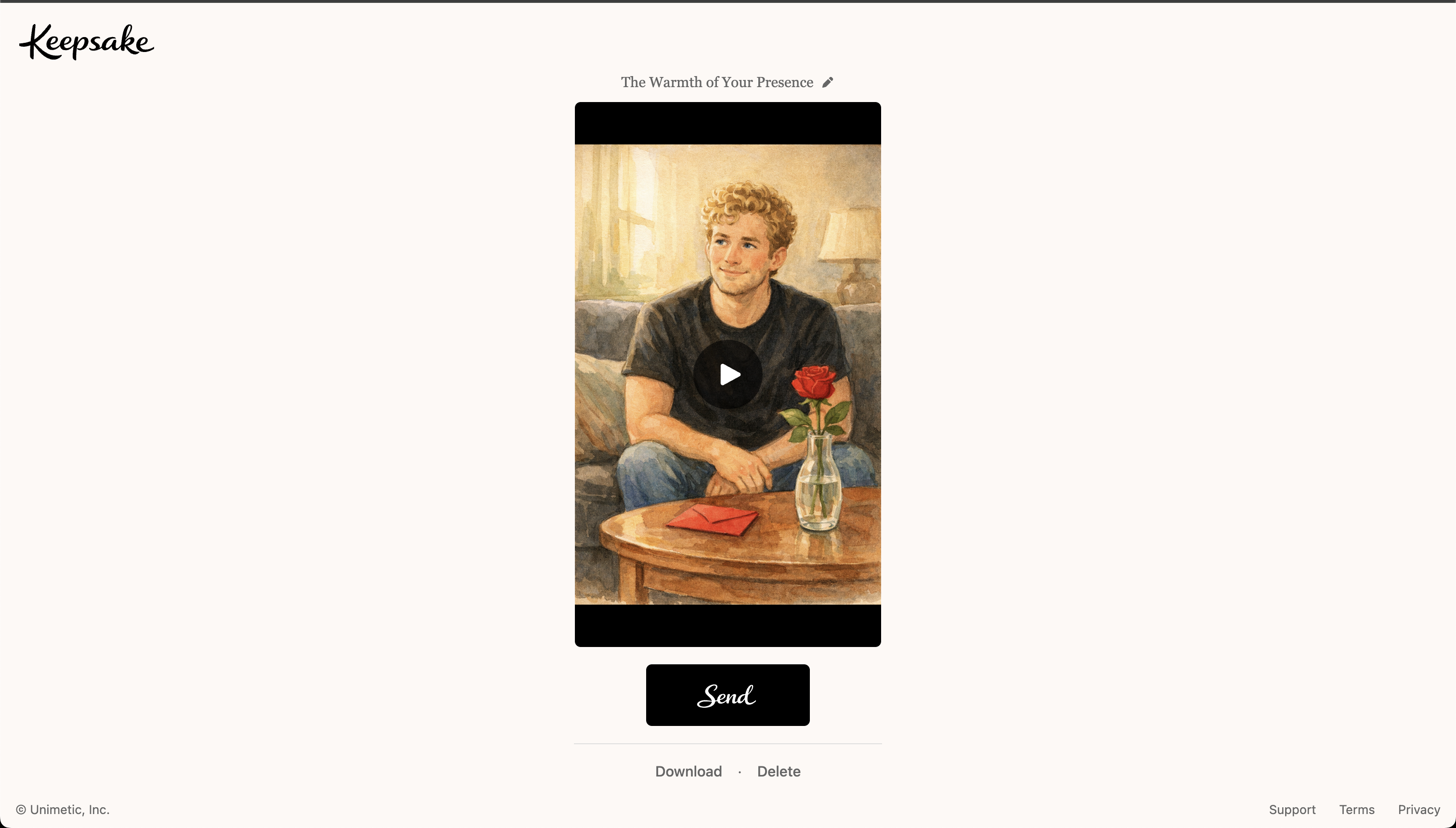 ## 概要 Keepsakeは、言葉と感情を出発点とする新しいタイプのギフト。テンプレートに頼らず、意味を起点にして、数分でナレーション付きのシネマティック動画に変換します。カード以上の“想い”...
