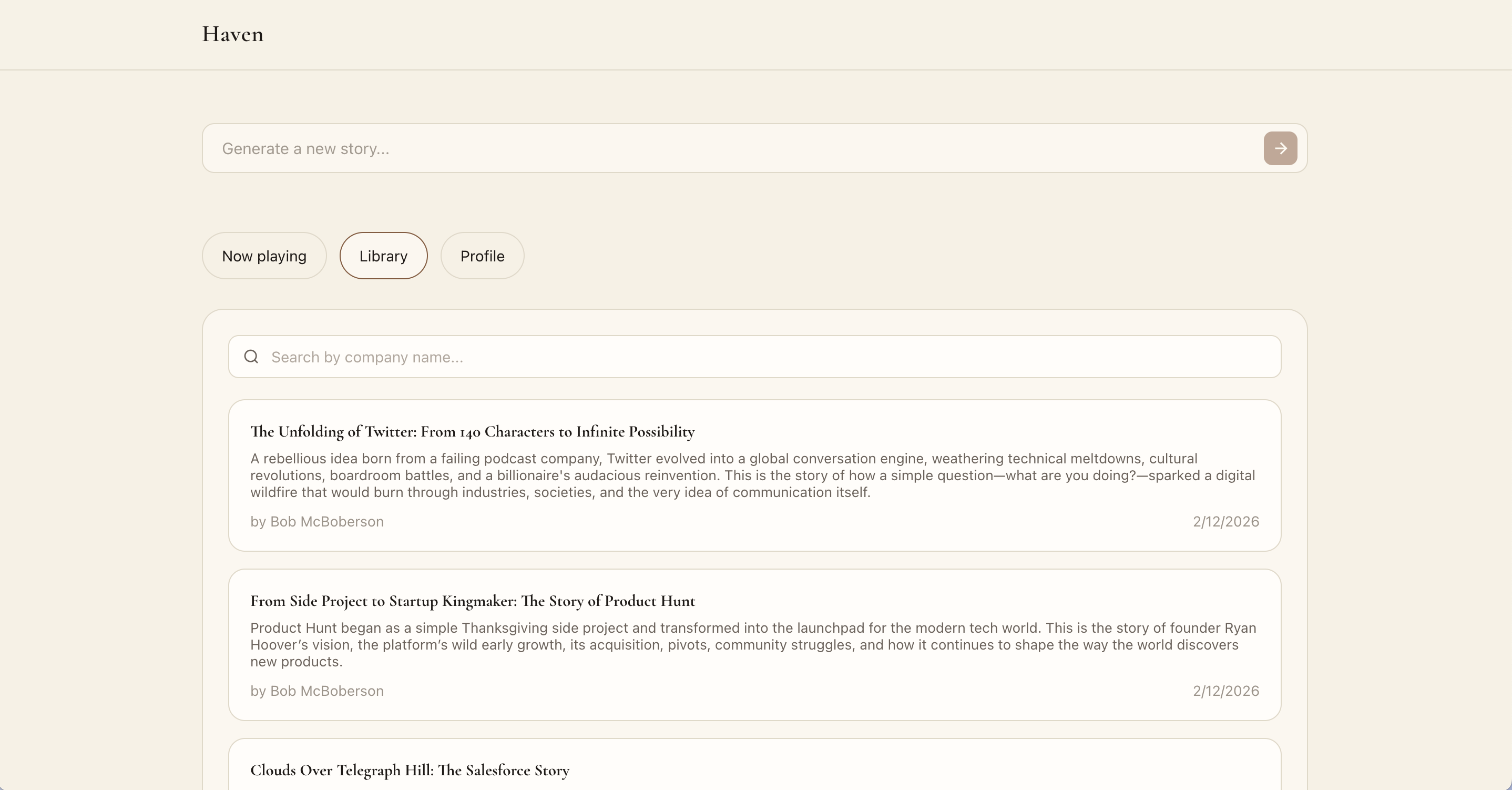 ## 製品概要 HavenはAIが企業を調査し、創業ストーリーを紡いだ物語をナレーション化して、どこでも聴ける形で提供します。あらゆる規模の企業に対応します。 ## 特長 - AIリサーチで幅...