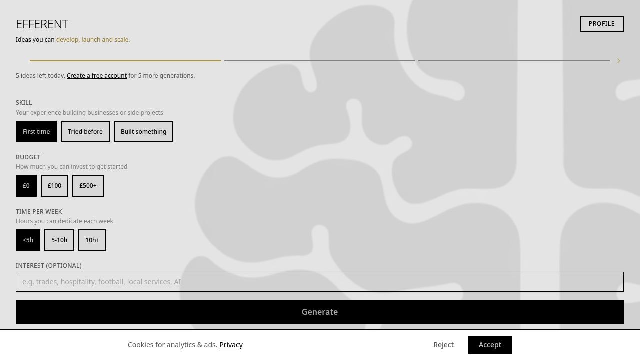 Efferent は、アイデアを生み出すだけでなく、実行へと導く道筋を提供するプラットフォームです。アイデアは、スキル・予算・時間・現実といった制約のもとで生成され、実際の市場ギャップと価格で検...