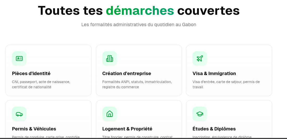 ## 製品概要 ガボンの行政手続きの複雑さを解消するAIアシスタント。複数の公的情報源を横断検索する代わりに、質問ひとつで手続きの手順、必要書類、期間、問い合わせ先までを分かりやすく提示します。...