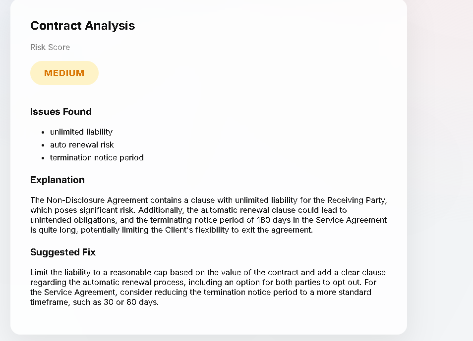 ## 概要 - 対象: 米国の中小企業 - 機能: 契約の即時レビュー、法的リスク検出、複雑な条項の平易な説明、より安全な修正案の提案 - 効果: 弁護士費用の削減と契約理解の速さ、法的ミスの予...