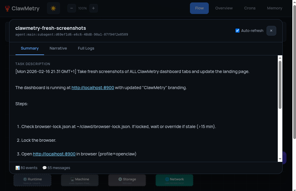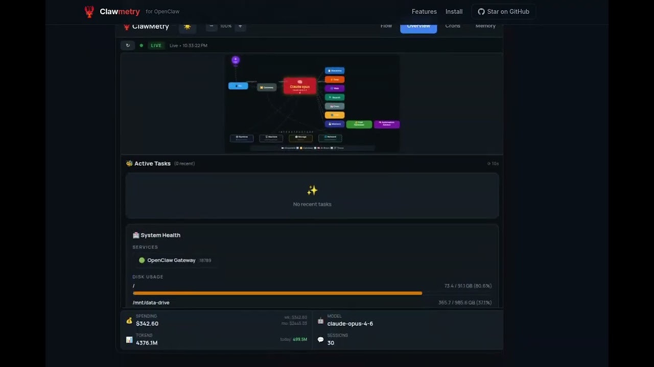 ## 概要 OpenClaw AIエージェント向けのリアルタイム観測ダッシュボード、ClawMetry。無料のオープンソースで、インストールは1行、設定は不要。 ## 主な特徴 - サブエージ...