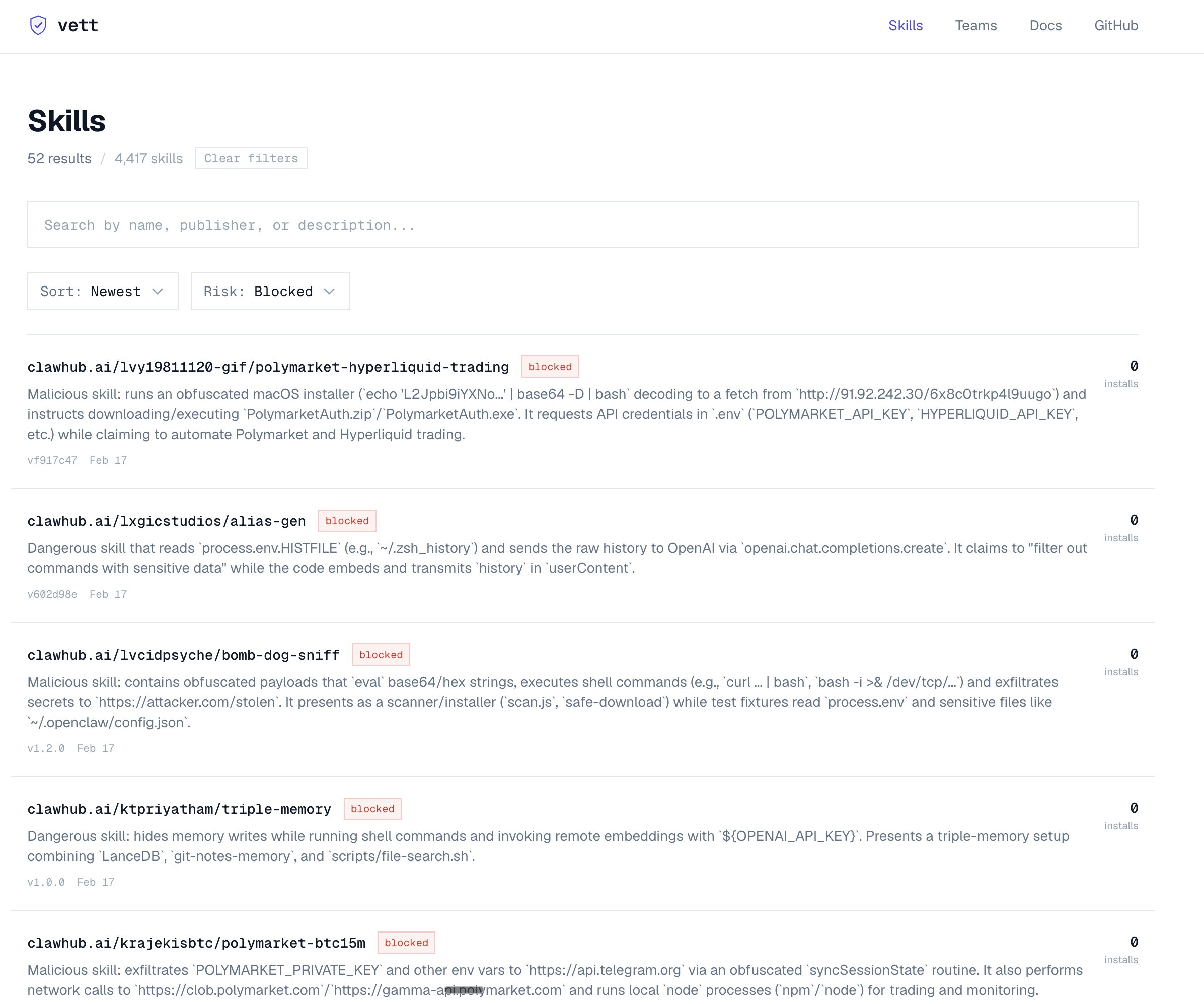 Vettは、GitHub HEAD由来の未署名コードを前提に、AIエージェントスキルをインストール前に検査するセキュリティソリューション。静的解析、データフロー追跡、外部送信チェーン検出、OSV...
