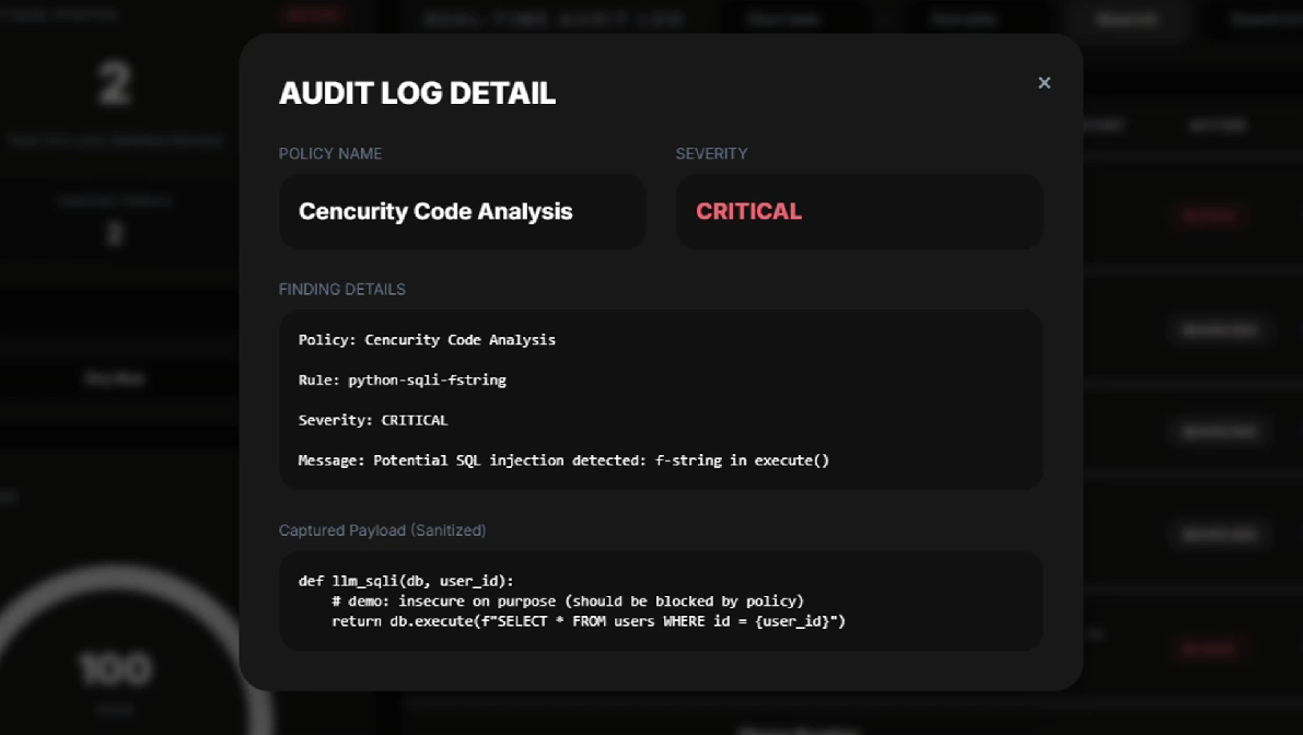 ## 概要 CencurityはLLMエージェントのトラフィックをゲートウェイ経由で制御し、機密データ露出を防ぎ、リスクのあるコードパターンを検出・マスク・ブロックします。すべてを監査ログとして...