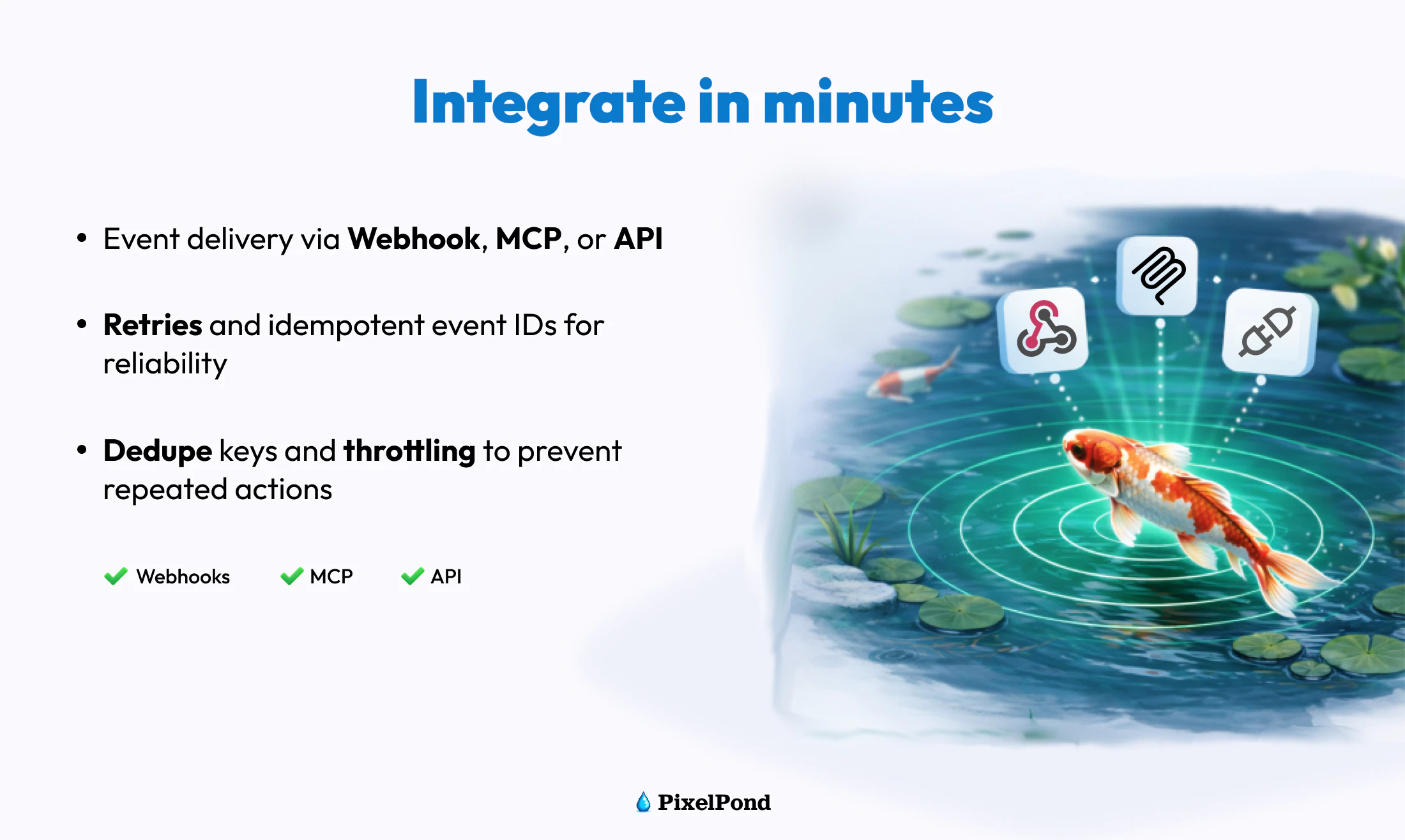 ## 製品概要 PixelpondはAIエージェント向けの自律的ウェブトリガーです。指定条件を平易な英語で記述し、指定ソースを継続監視。条件一致時には証拠・信頼度・出典を含むJSONイベントをW...