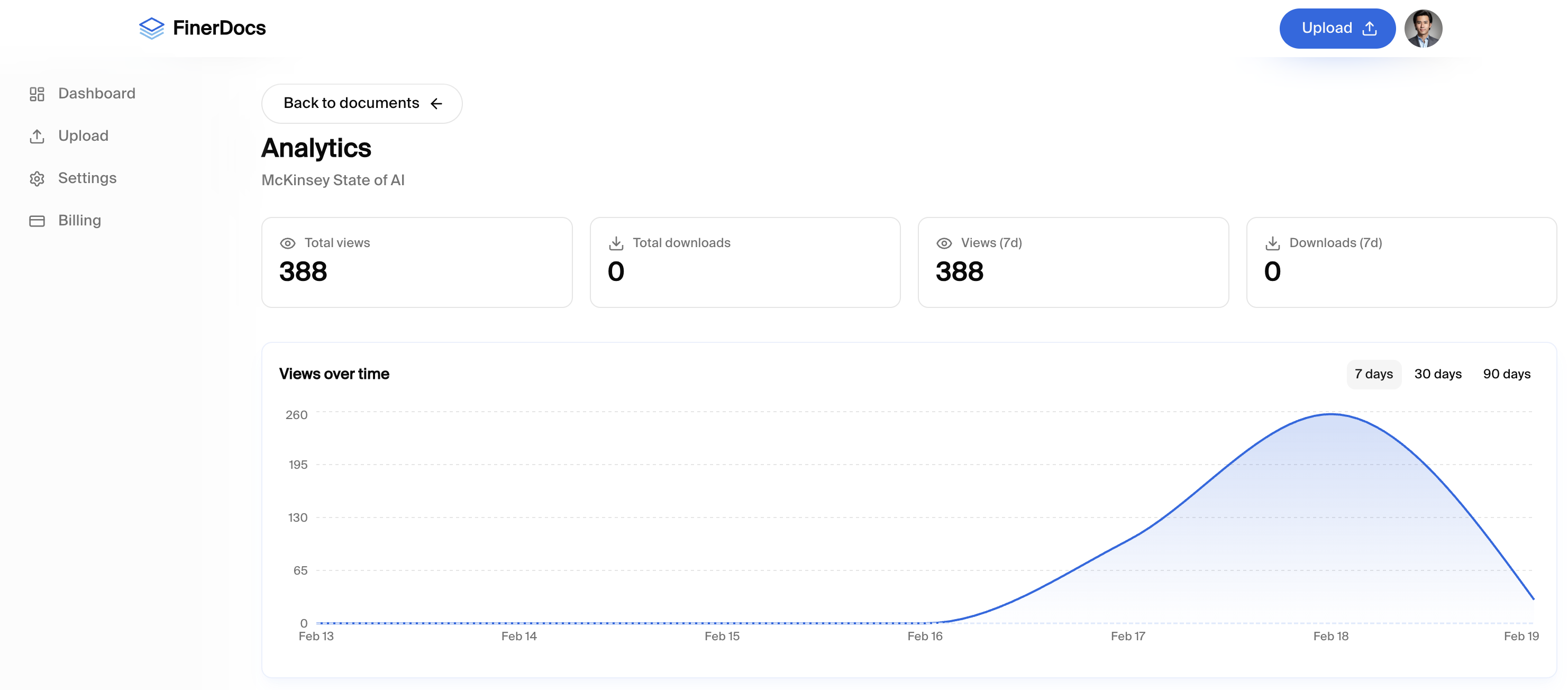 要約: FinerDocsはPDFをオンラインで迅速に共有できるプラットフォーム。リンク共有・ブラウザ閲覧・サインアップ不要を実現。AIチャットで質問、閲覧分析で読者を把握、パスワード保護とリン...