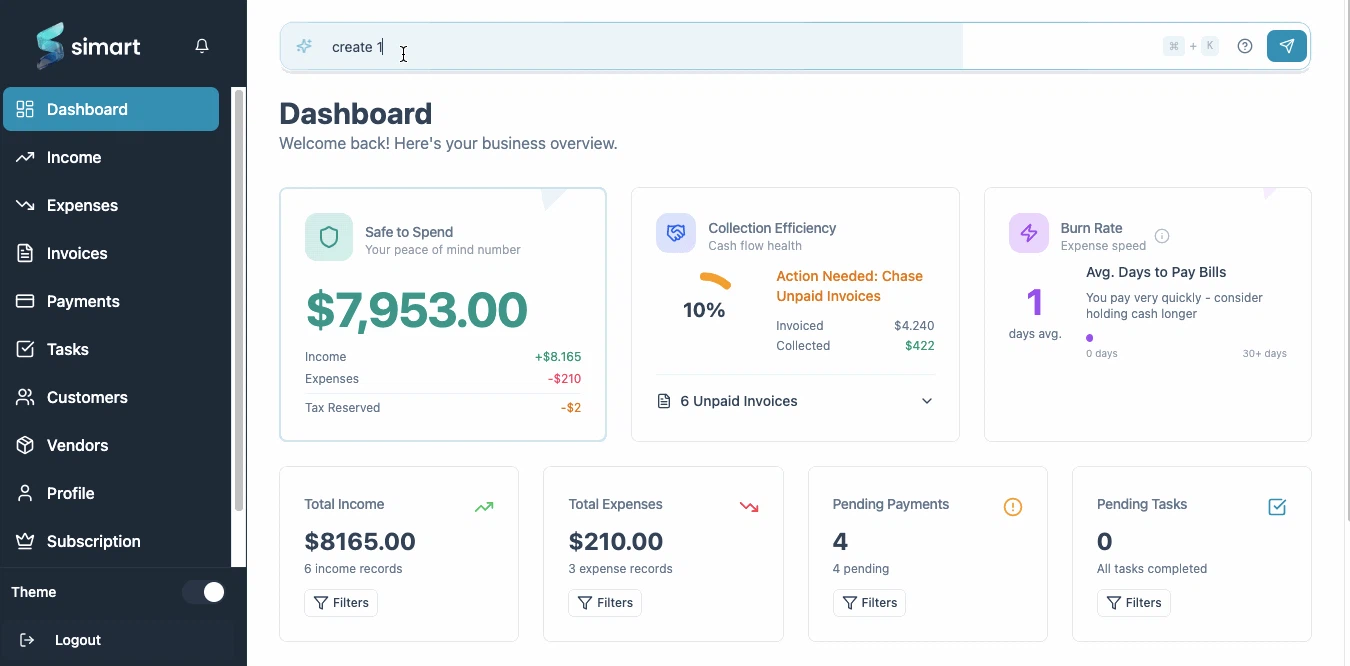 ## 概要 - SimartはAIコマンドバーで経費を素早く記録するツールです。 - 実際に使える額を自動計算し、内部リマインダーで請求のフォローアップを人間味ある形に保ちます。 ## 主な特...