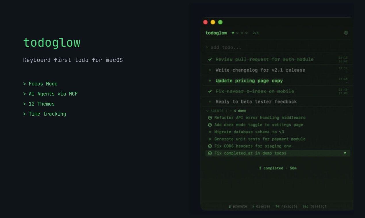 キーボード操作を中心とした macOS 向けの TODO アプリ。MCP対応で Claude Code や Cursor のような AI コーディングエージェントと連携可能。グローバルショートカ...