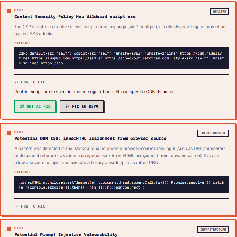 ## 製品概要 - URL を貼るだけで 60 秒のセキュリティレポートを取得 - Cursor、Bolt、Lovable、Claude Code が作るミスに合わせた 55 件以上のチェック ...