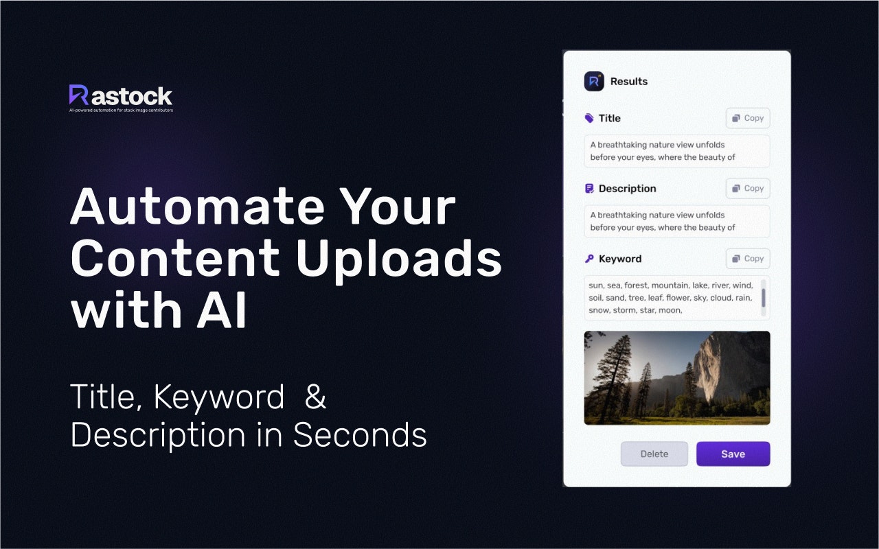 Rastock AI は、ストック写真・映像の作成とメタデータ生成・納品を自動化する AI 主導のプラットフォーム。SEO 対応のタイトル・説明・キーワードを自動生成し、セキュアな FTP/SF...