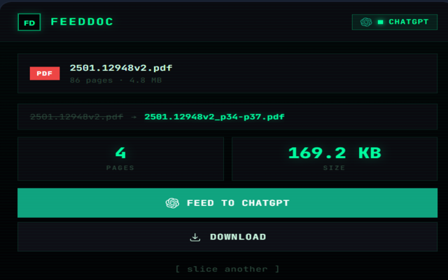 FeedDocは、PDF/PPTX/DOCXの任意のページ範囲を抽出し、ワンクリックでChatGPT、Claude、Grok、T3 ChatなどのAIチャットに直接添付するブラウザベースのツール...