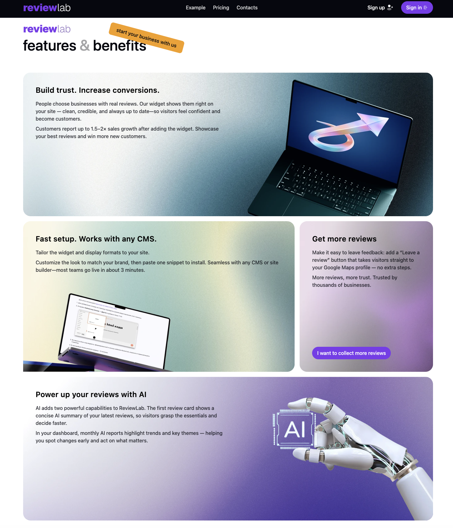 ReviewLabはGoogleマップの実際のレビューを自動収集し、ウェブサイトにリアルタイムで表示するウィジェットです。手動更新を不要にし、レビューを自動同期・一元管理します。信頼性の高いソー...