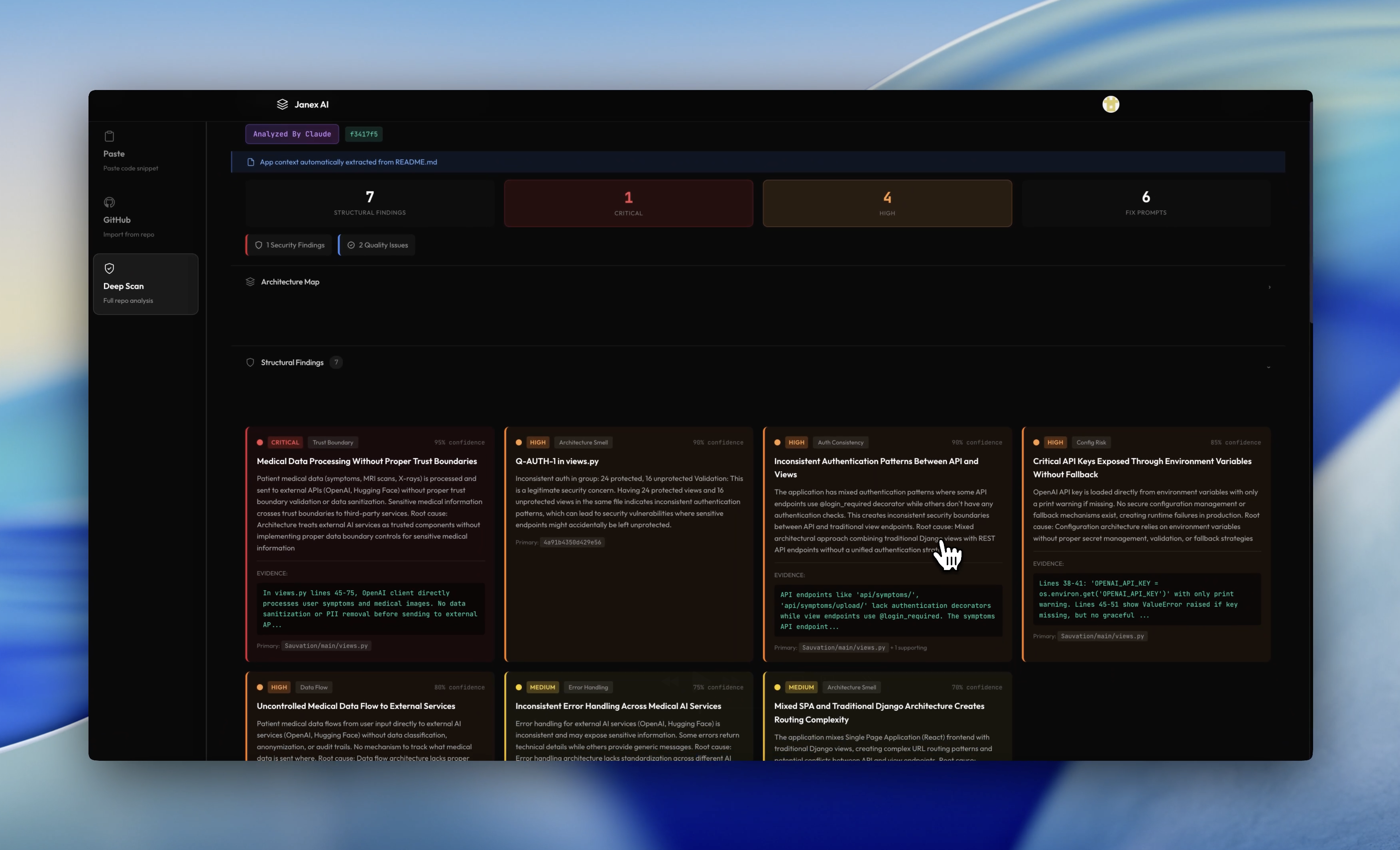 ## 概要 Janexはリポジトリ全体をスキャンしてセキュリティ脆弱性・品質・アーキテクチャリスクを検出するAI搭載のコード分析プラットフォーム。従来のファイル単位の静的解析とは異なり、全体の依...