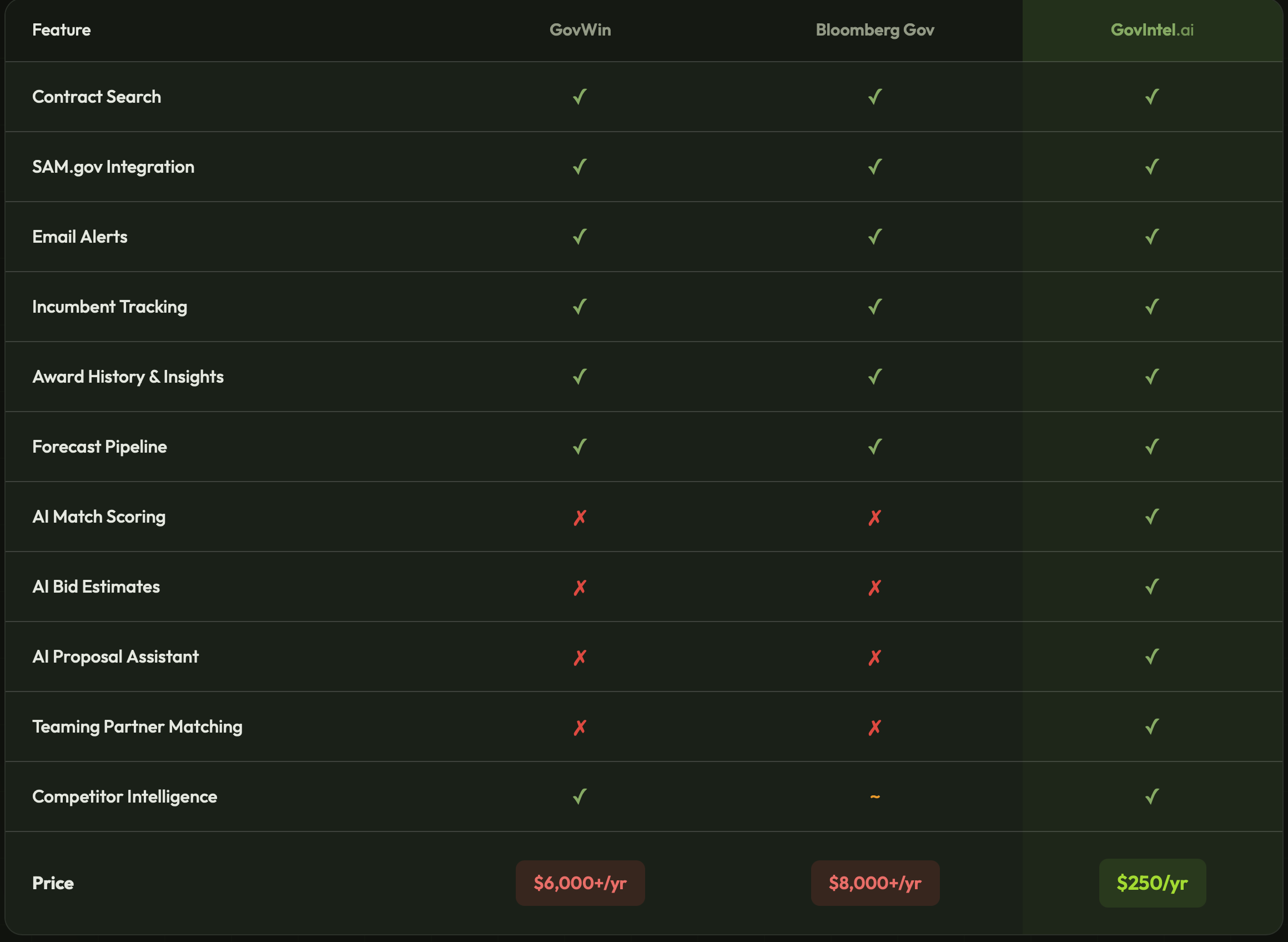 ## 製品概要 GovIntelは、27州の政府契約情報・SAM.gov・Grants.govなどを一元化した検索プラットフォームです。AIマッチングが貴社のプロフィール・NAICSコード・認証...
