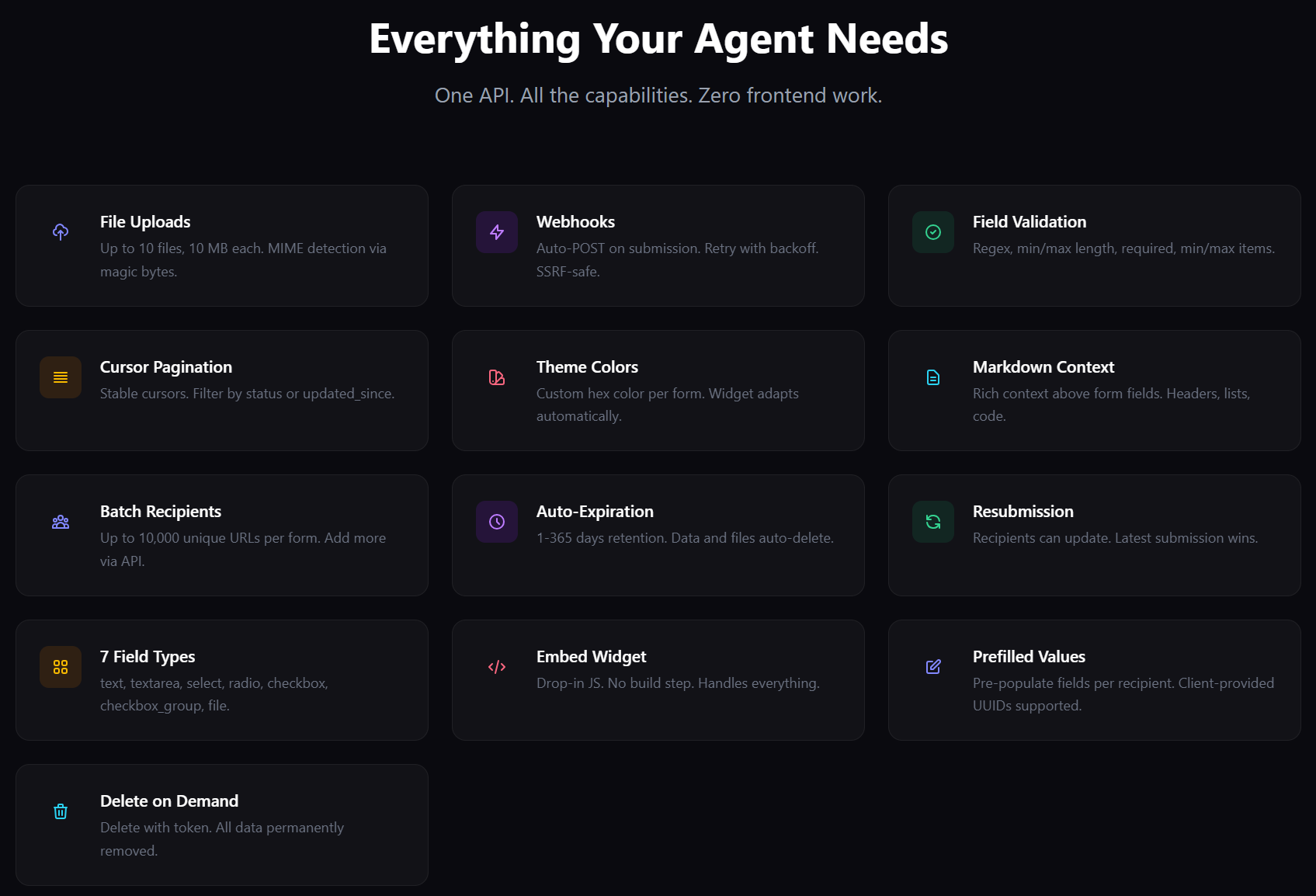 LetsClarifyは、AIエージェントの意思決定や承認プロセスに人間を介在させるためのAPIファーストなフォームワークフロー。JSONスキーマをPOSTするだけで受信者ごとに一意のフォームU...
