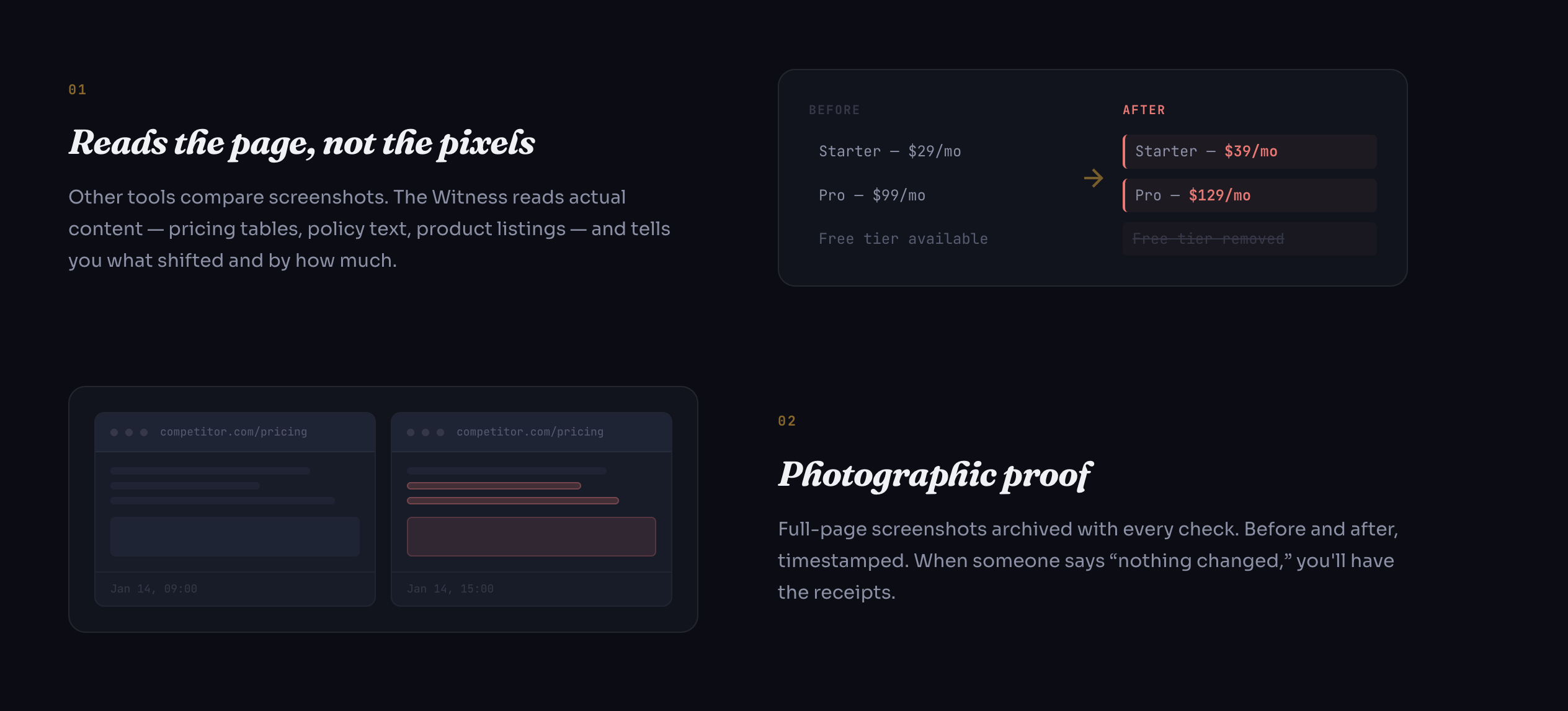 公開URLを監視し、定期的に全ページのスクリーンショットを取得。ノイズを除去した後、AIの2段階分析で何が変わったかを要約し、0-100のスケールで重要度を示す。通知はSlack/Discord...