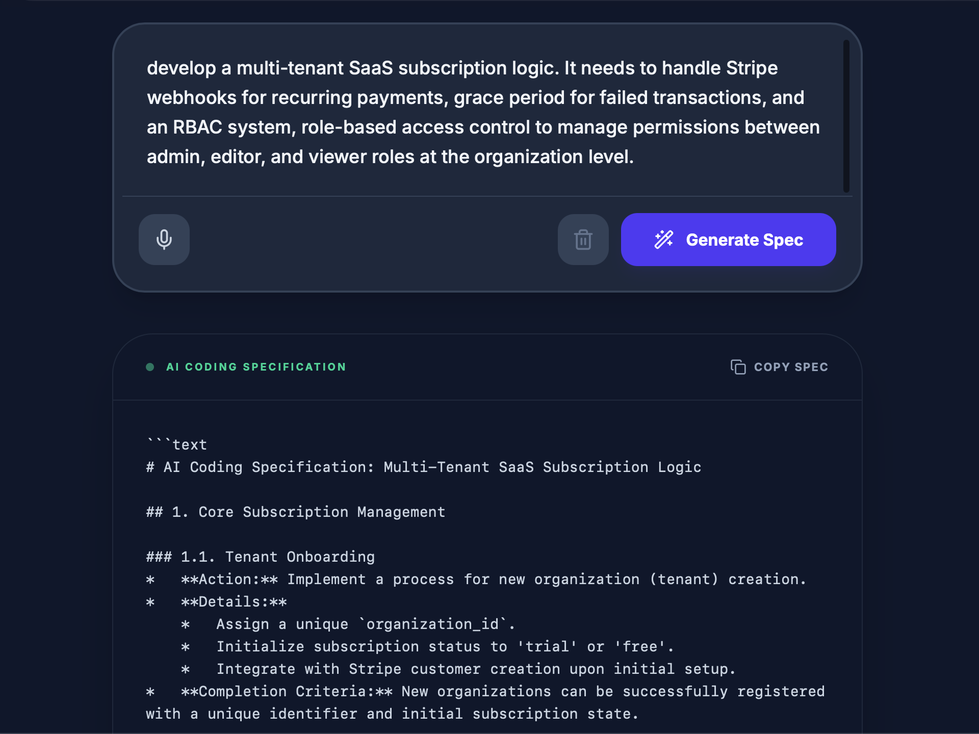 ## 概要 自然言語をAIエージェントの正確な仕様へ変換する橋渡しツール。Claude・Cursor・Windsurf ユーザーがアイデアを過剰設計せず、安定した本番コードへ移行できるよう、漠然...