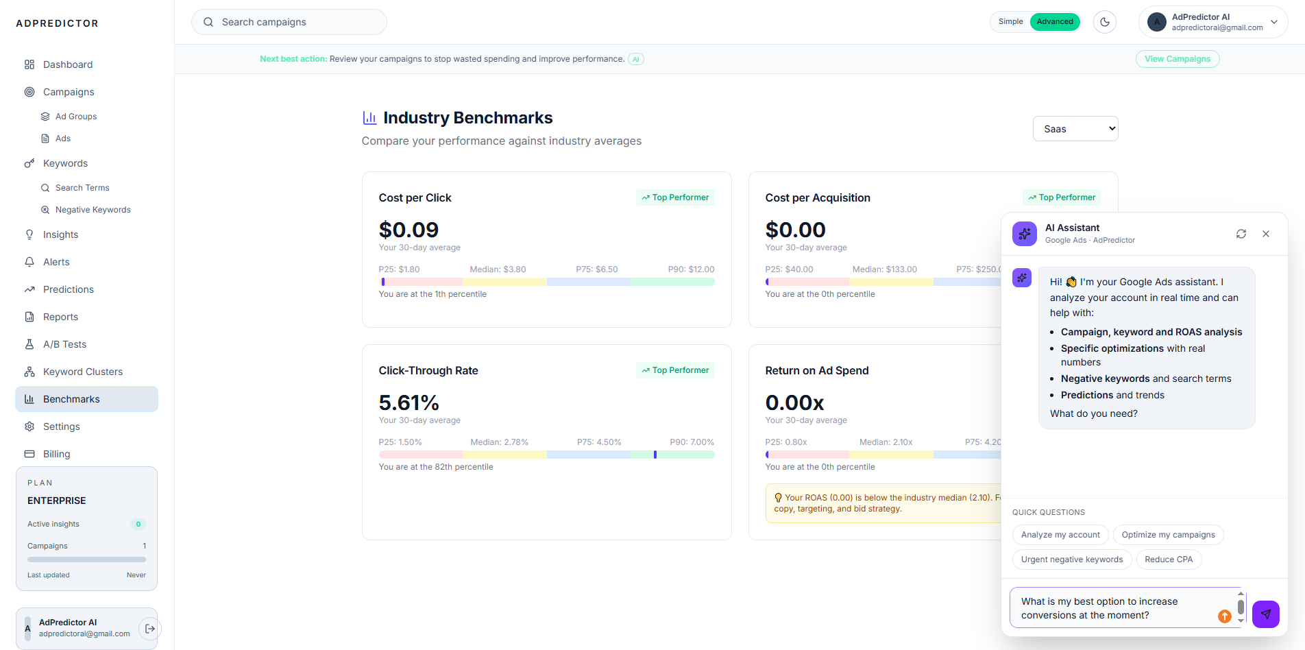AdPredictor AI は Google 広告運用を自動化・最適化する AI ツールです。無駄な支出を検出し、1画面でキーワードの意思決定を支援します。実データから生成される広告コピーと、...