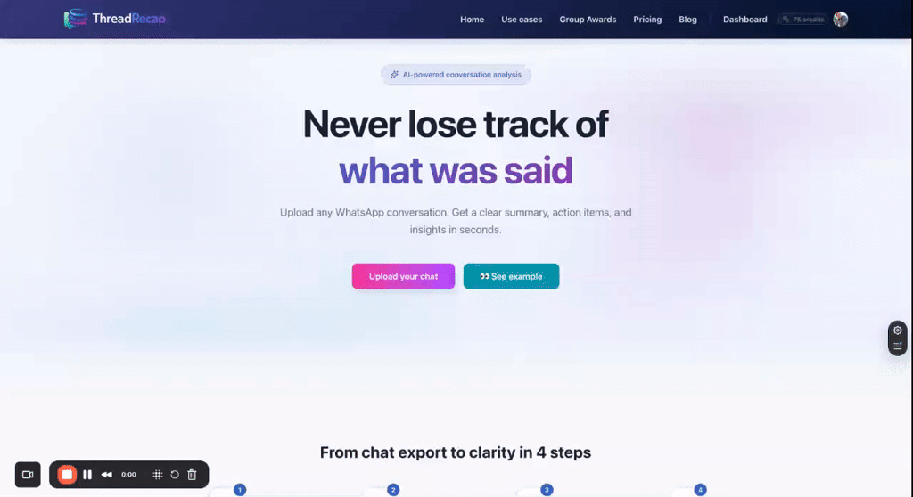 ## 概要 WhatsApp の会話を AI で分析するツール。会話をエクスポートしてアップロードすると、要約・意思決定・アクションアイテム・未解決の質問・際立つ引用をすぐに取得。音声メッセージ...