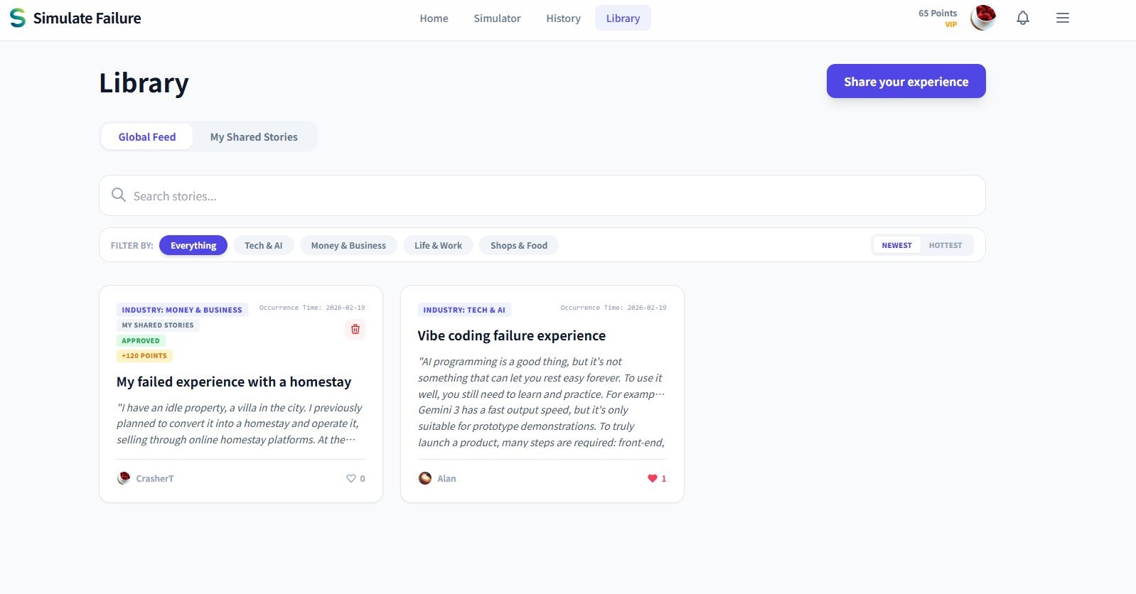## 概要 Simulate FailureはAIを活用したキャリア支援プラットフォームで、潜在的な失敗シナリオを再現することで、職場で直面する課題に事前に備えることを目的としています。他者の経...