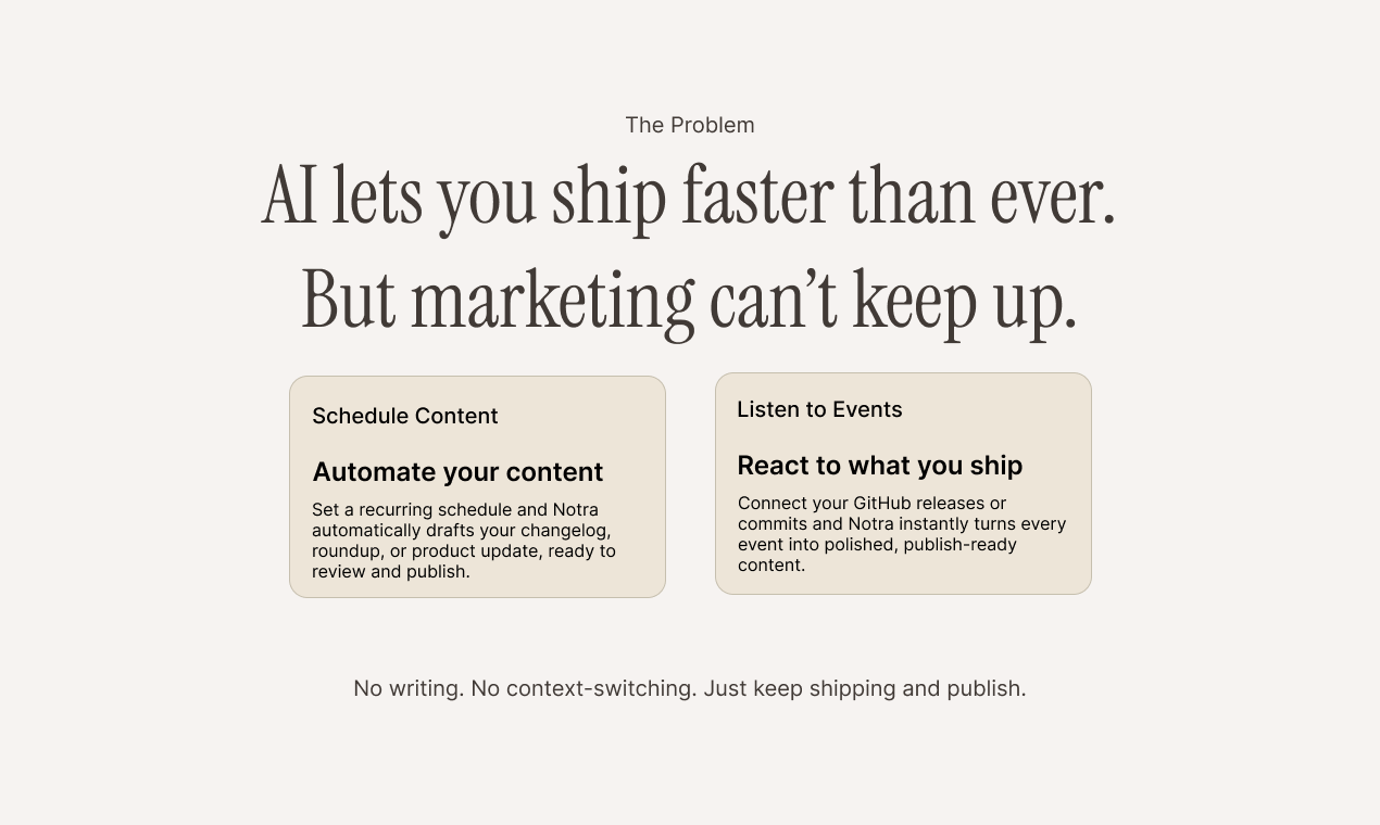 ## 概要 Notra は開発ワークフローと公開物をつなぐ連携ツール。出荷済みの作業を公開準備が整ったチェンジログ、ブログ、ソーシャル投稿へ自動変換します。 ## 主な特徴 - GitHub/...