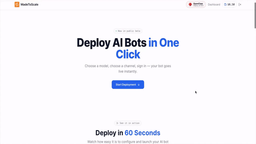Deploy Open-Claw and custom AI agents directly to Telegram, WhatsApp, and Discord, no servers, no...