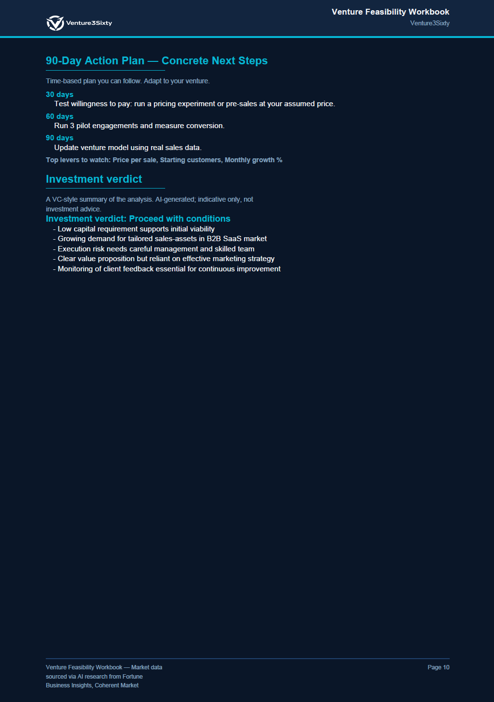Get a venture score, financial projections, key risks, and a feasibility workbook for your startu...