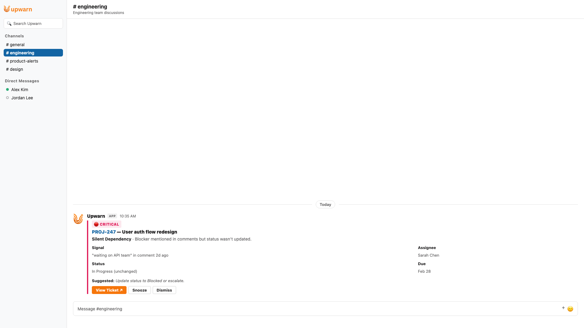 ## 概要 Upwarn はトラッカーと Slack を連携し、Jira・Linear・ClickUp・GitHub のチケットを横断的に監視。放置チケット、担当者不在、隠れブロックを検出して、...