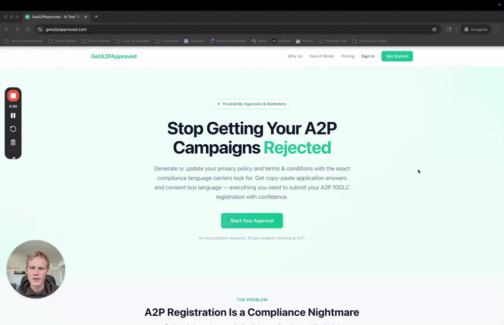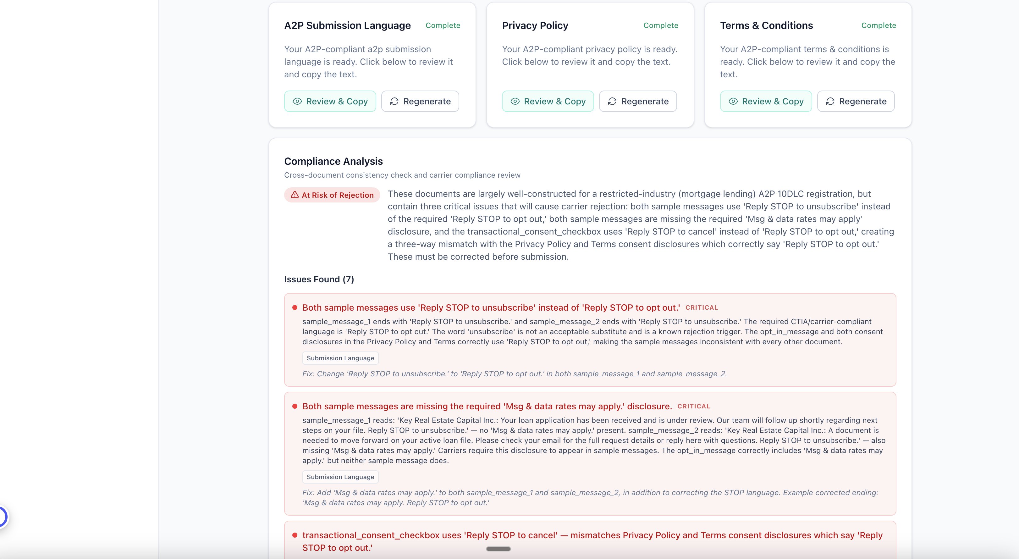 GetA2PApprovedは、A2P 10DLC登録に必要なプライバシーポリシー、利用規約、提出文言の3文書を、1つの質問票から自動生成します。文書間の整合性を自動照合し、キャリア要件を満たす...