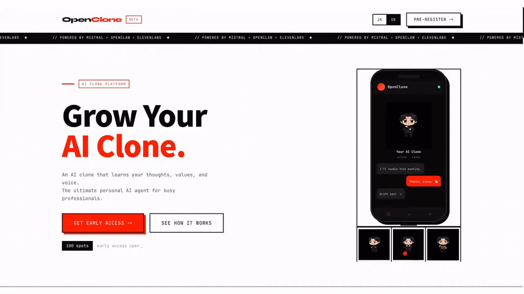 ## 概要 OpenCloneは、あなたの思考パターン・価値観・声を学習する個人用AIクローンです。8つの質問で思考スタイルを取得し、 ElevenLabsの技術で声を再現。ピクセルアバターがス...