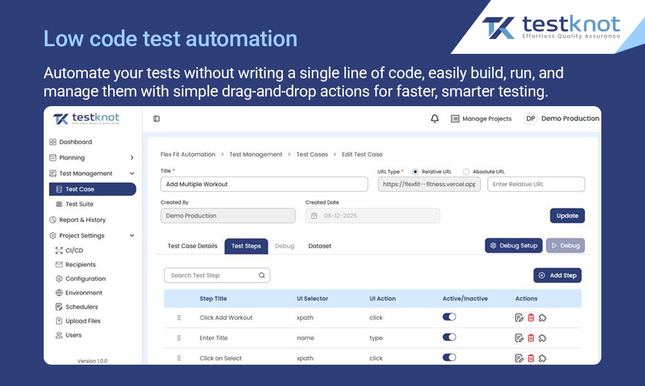 Testknotは、手間をかけずに品質保証を実現するローコードの自動化テストツールです。ノーコードでテスト作成・実行・管理が可能で、技術者・非技術者の両方が協力してQAを加速します。使いやすさと...