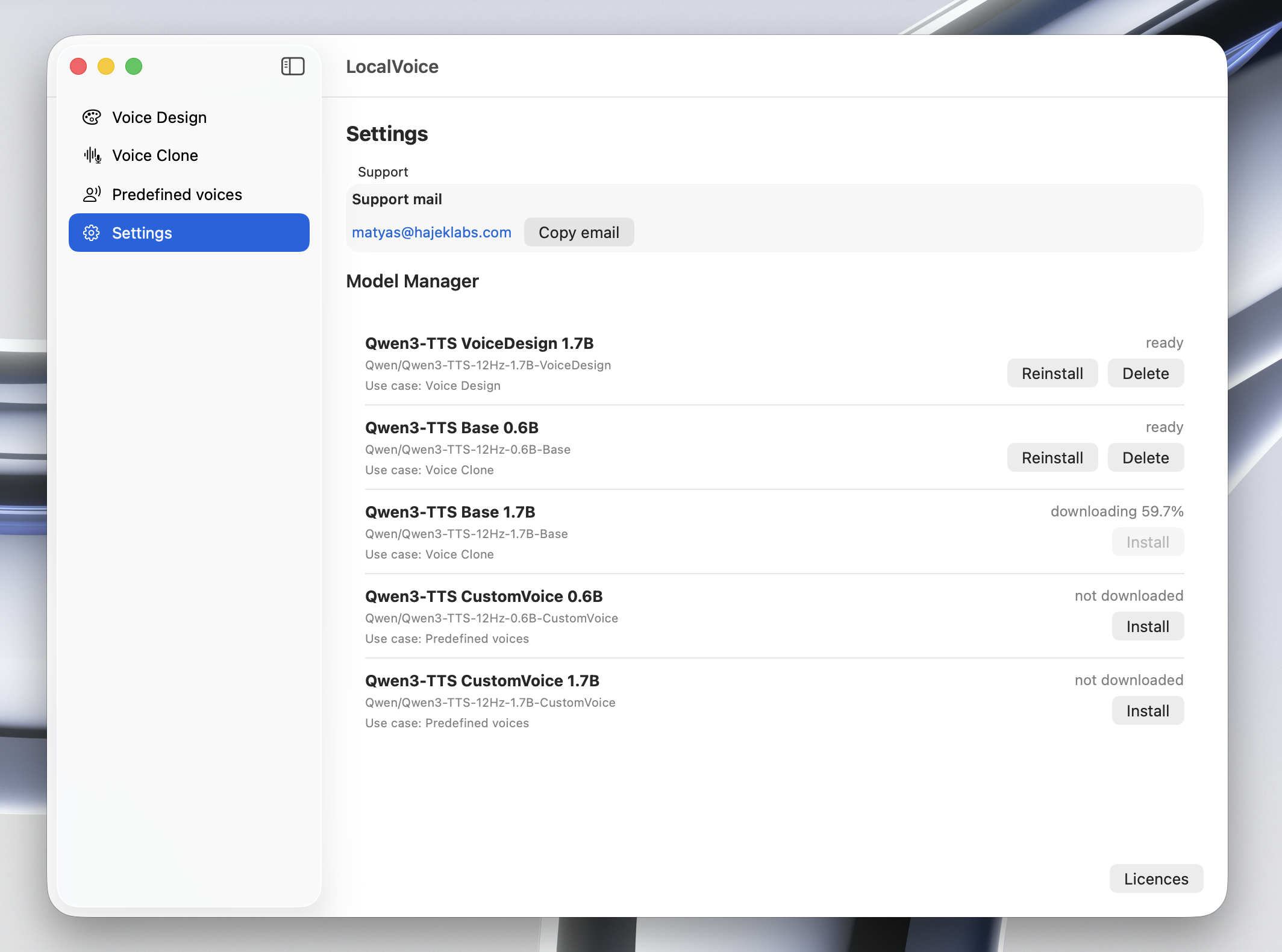 ##概要 LocalVoiceはMac上で完結する完全オフラインのTTS・声のクローン作成ツールです。クラウド依存なし・データは端末内に留まります。 ##特徴 - 短い音声サンプルから声をクロ...