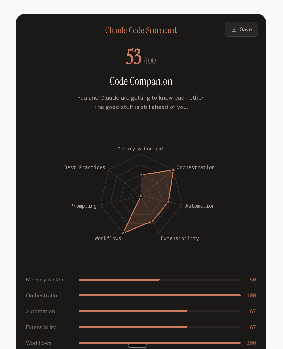 ##概要 Claude Codeの機能を楽しく知るインタラクティブゲーム。6ラウンド・15チャレンジを通じて、7つのスキル領域を蜘蛛の巣状のレーダーチャートで可視化し、得点に応じたアーキタイプの...