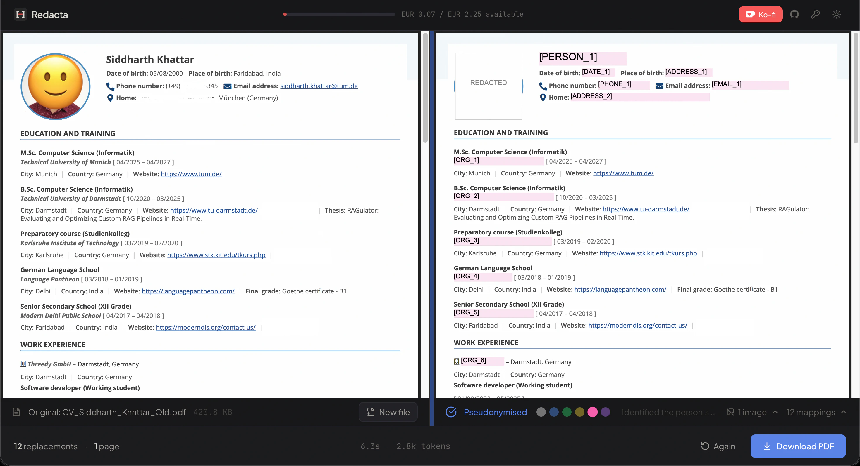 Free AI PDF redaction tool. Permanently redact or pseudonymise PII in text and images. No signup,...