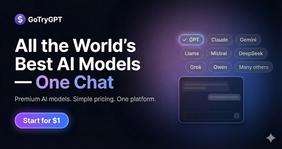 GoTryGPT offers affordable access to 100+ AI models from OpenAI, Google, Anthropic, xAI, Meta, Mi...