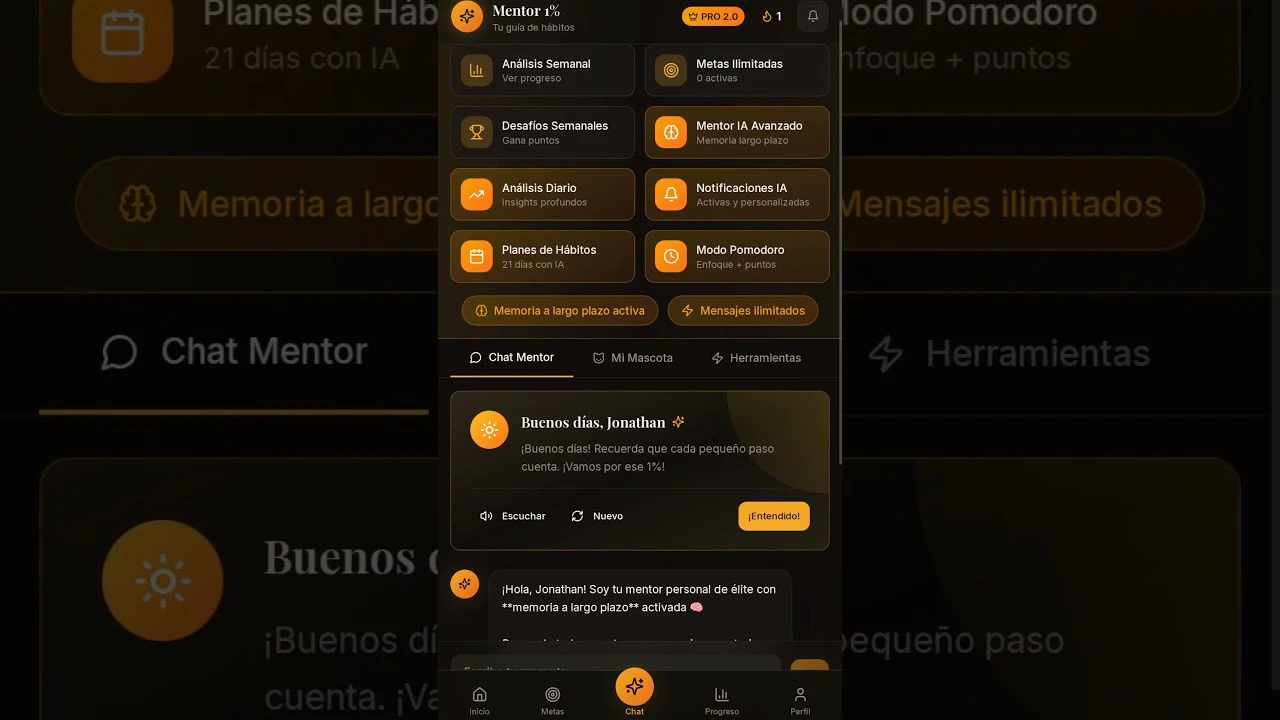 Mentor 1% es la primera app de hábitos que combina un robot personalizable con gamificación profu...