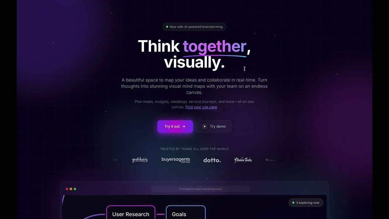 Flowtogetherは、ビジュアル思考の速いチーム向けの共同マインドマッピングツールです。無限キャンバスでアイデアを戦略から細部まで組み立て、AIがマップ内でブレインストーミングを生成・ノー...