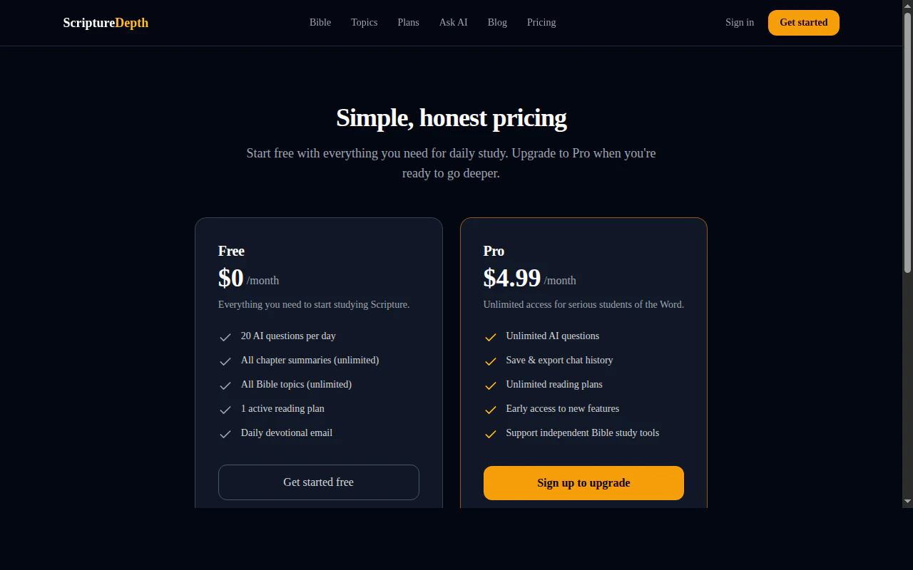 ScriptureDepth is an AI-native Bible study companion for anyone who wants to understand Scripture...