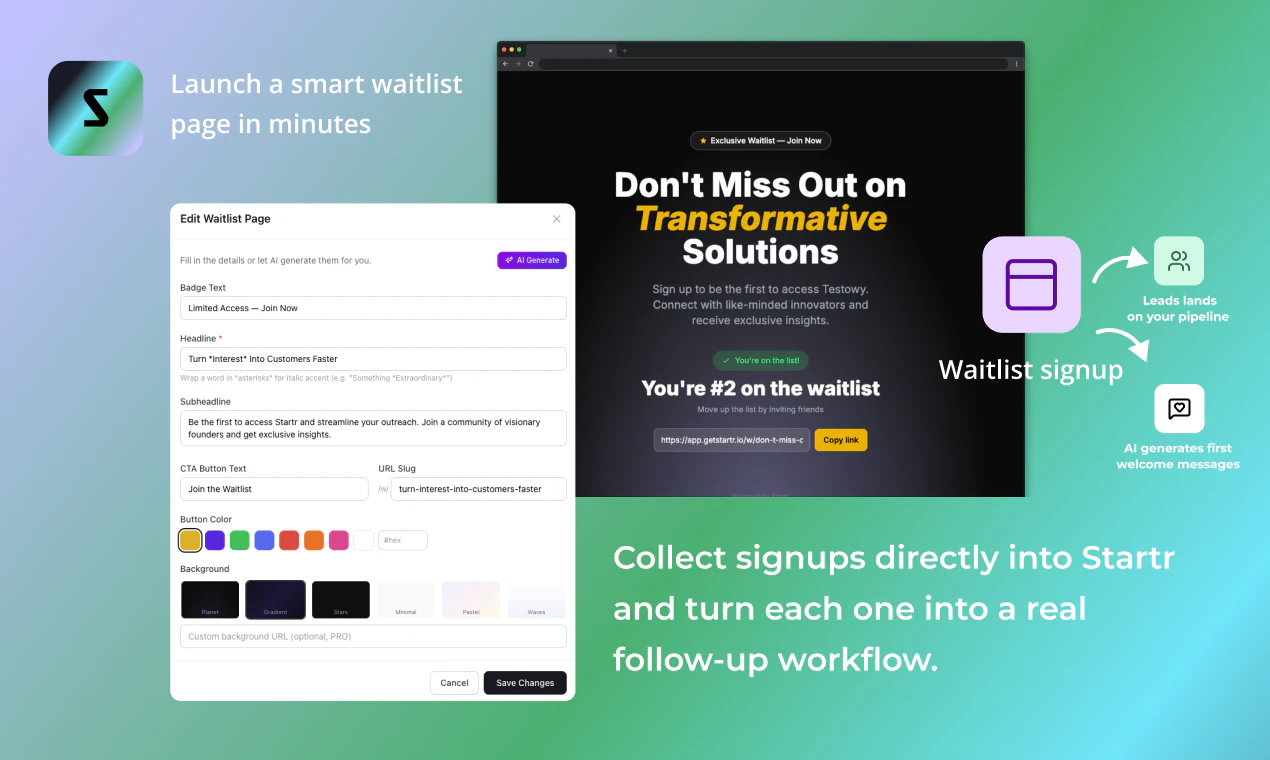 Startr is an AI launch agent for solo founders. It helps you capture early interest with smart wa...